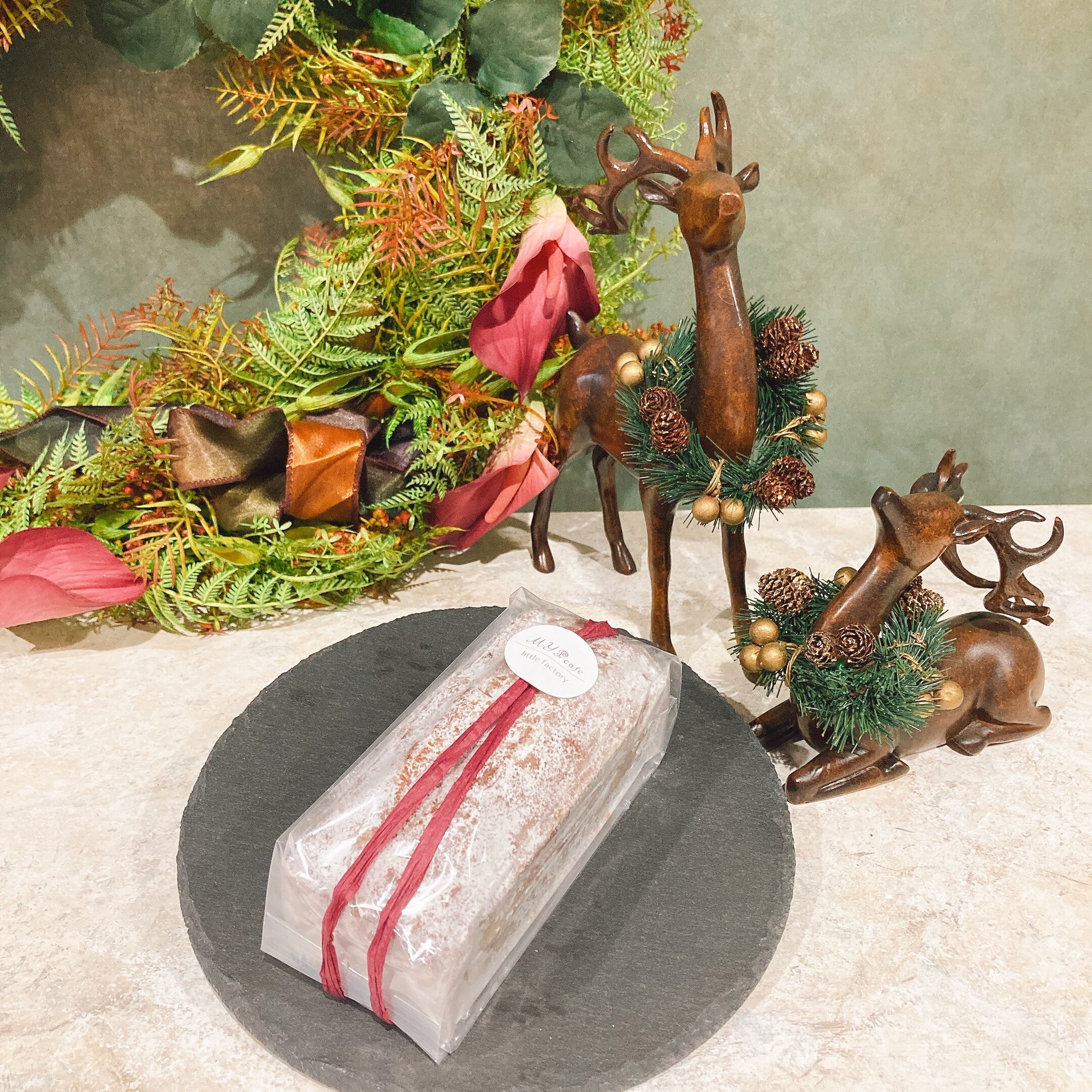 洋酒に漬け込んだレーズン、ドライいちじく、くるみ、アーモンド、ニューサマーオレンジピールがスパイスの効いた生地にたっぷり入っています。バターを塗って粉糖を振りシュトーレン風に仕上げました。
